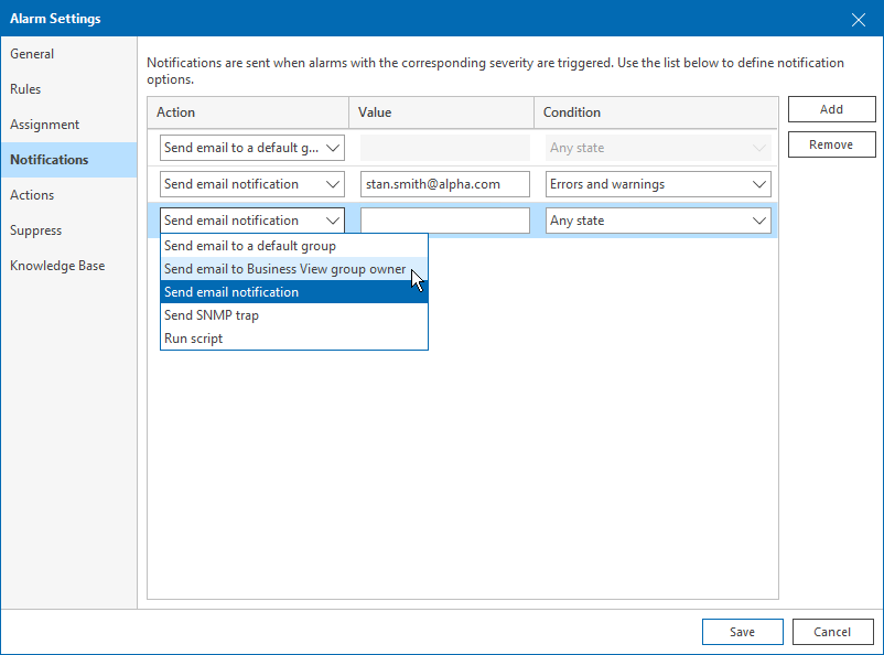 To receive notifications, you must specify an email address of a group owner in the Veeam ONE Business View group settings. For details, see Configuring Multiple-Condition Categorization.