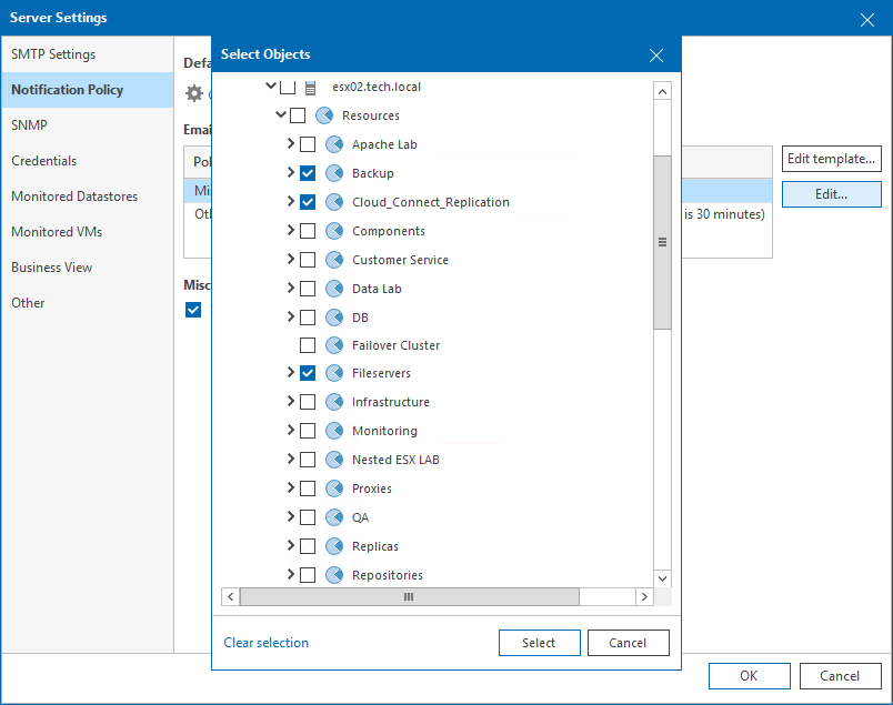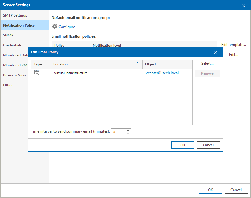 - In the Edit Email Policy window, select the necessary type of infrastructure objects — Virtual Infrastructure, vCloud Infrastructure or Backup Infrastructure) and click Remove.