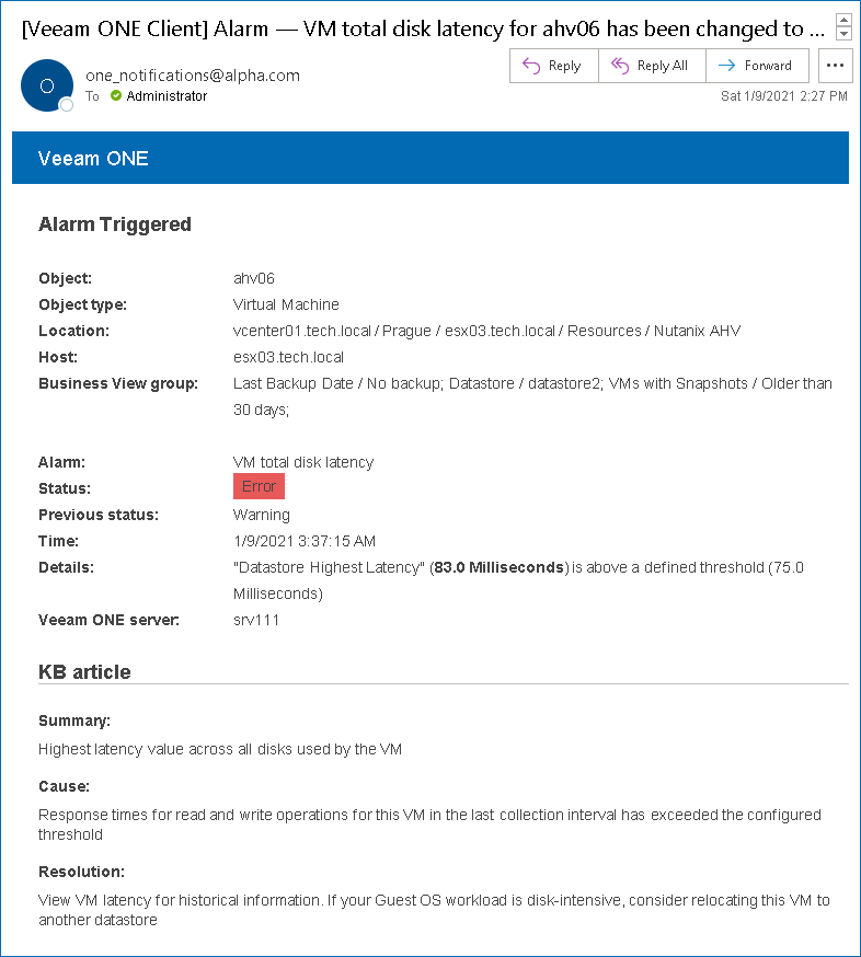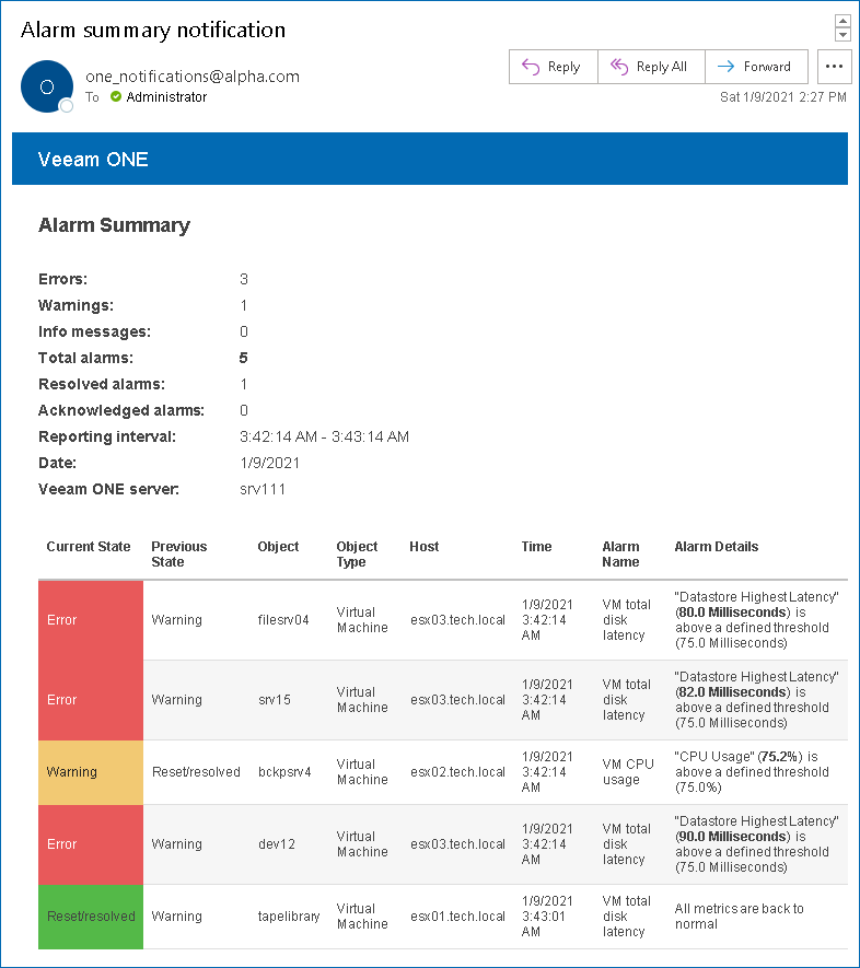 Mission Critical notification policy is the default policy that is enabled for all infrastructure objects. This policy prescribes Veeam ONE to send an email notification every time a new alarm is created or the status of an existing alarm changes. An email notification contains details on the triggered alarm and affected object.