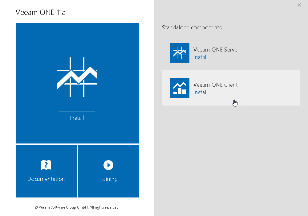 After you mount or insert the disk with Veeam ONE installation image, Autorun will open a splash screen with installation options. On the splash window, click Veeam ONE Client on the right to launch the Veeam ONE Setup wizard.