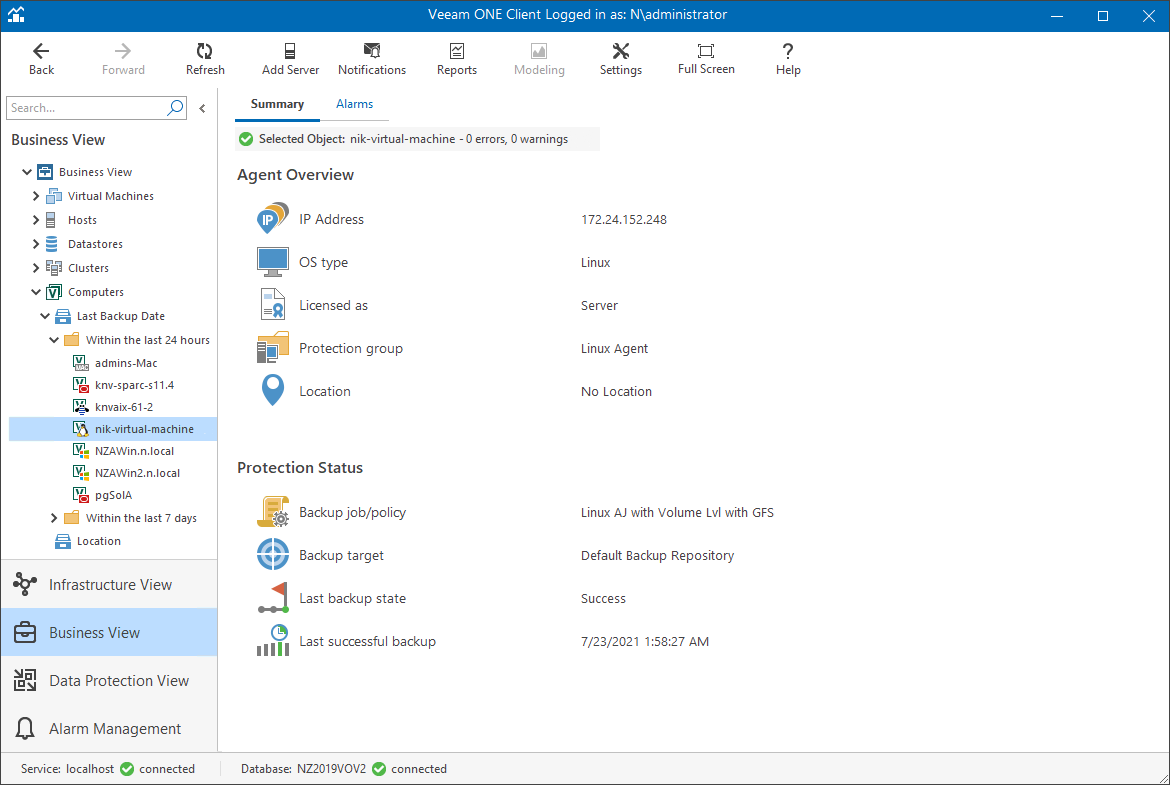 The Summary dashboard for a single computer node presents an overview and protection status details for computers running Veeam Agent for Windows, Veeam Agent for Linux, Veeam Agent for Mac and Veeam Agent for Unix.