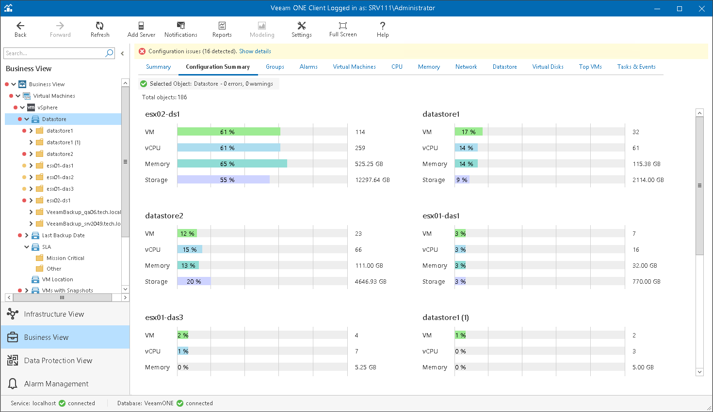 The dashboard acts as detailed monitoring panel: it presents virtual infrastructure objects from the perspective of business view categories. For each category, Configuration Summary provides information on the groups included in the category, shows how many objects belong to these groups, and provides information on the total number of objects in a group of their vCPU, memory and storage resources.