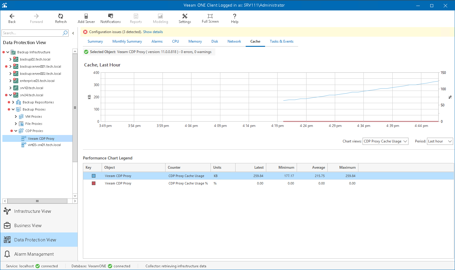 The Cache chart shows the amount of space consumed by the data processed during CDP operations. Graphs in the chart display how much data is stored in the cache folder on the machine where CDP Proxy component runs and the percentage of allocated cache space consumed by this data.