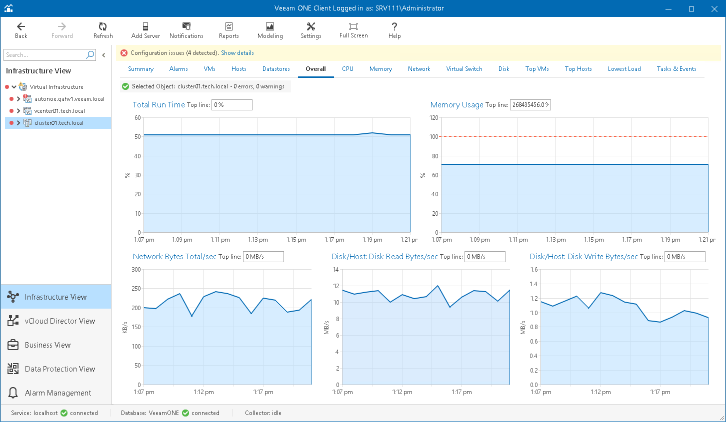 The Overall chart shows aggregated performance data for the selected virtual infrastructure object or segment: total run time, memory usage, network, disk/host read and write speed. Performance data in the chart is shown for the previous 15 minutes.