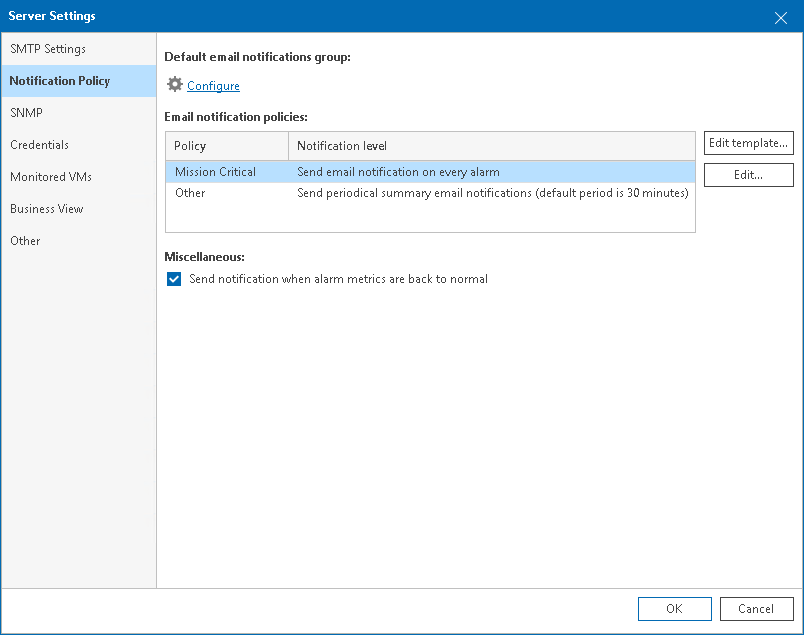 - In the Miscellaneous section, choose whether you want to send email notifications when conditions that triggered alarms return to normal.