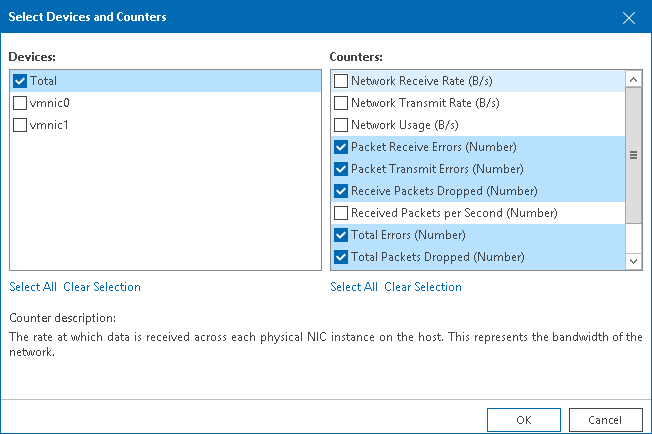 - From the Chart views list, select the Custom option to open the Select Devices and Counters window.
