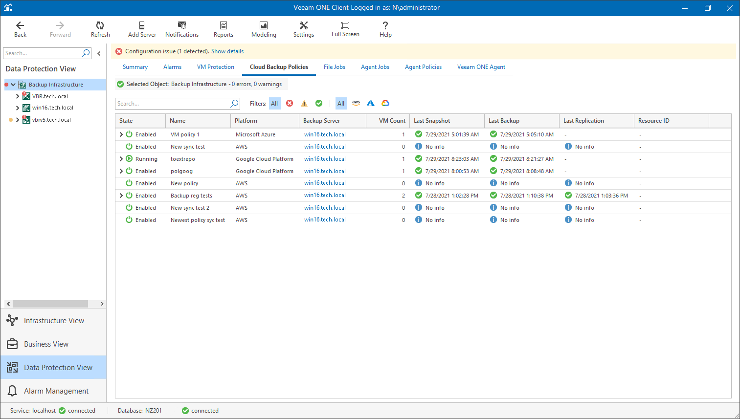 Veeam ONE Client allows you to track Veeam Backup for Microsoft Azure, Veeam Backup for AWS and Veeam Backup for Google Cloud Platform policies that store backups on external repositories integrated with Veeam Backup & Replication servers.