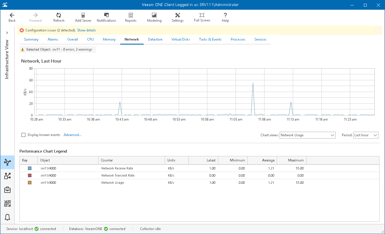 The Network chart displays historical statistics on network usage for the selected infrastructure object.