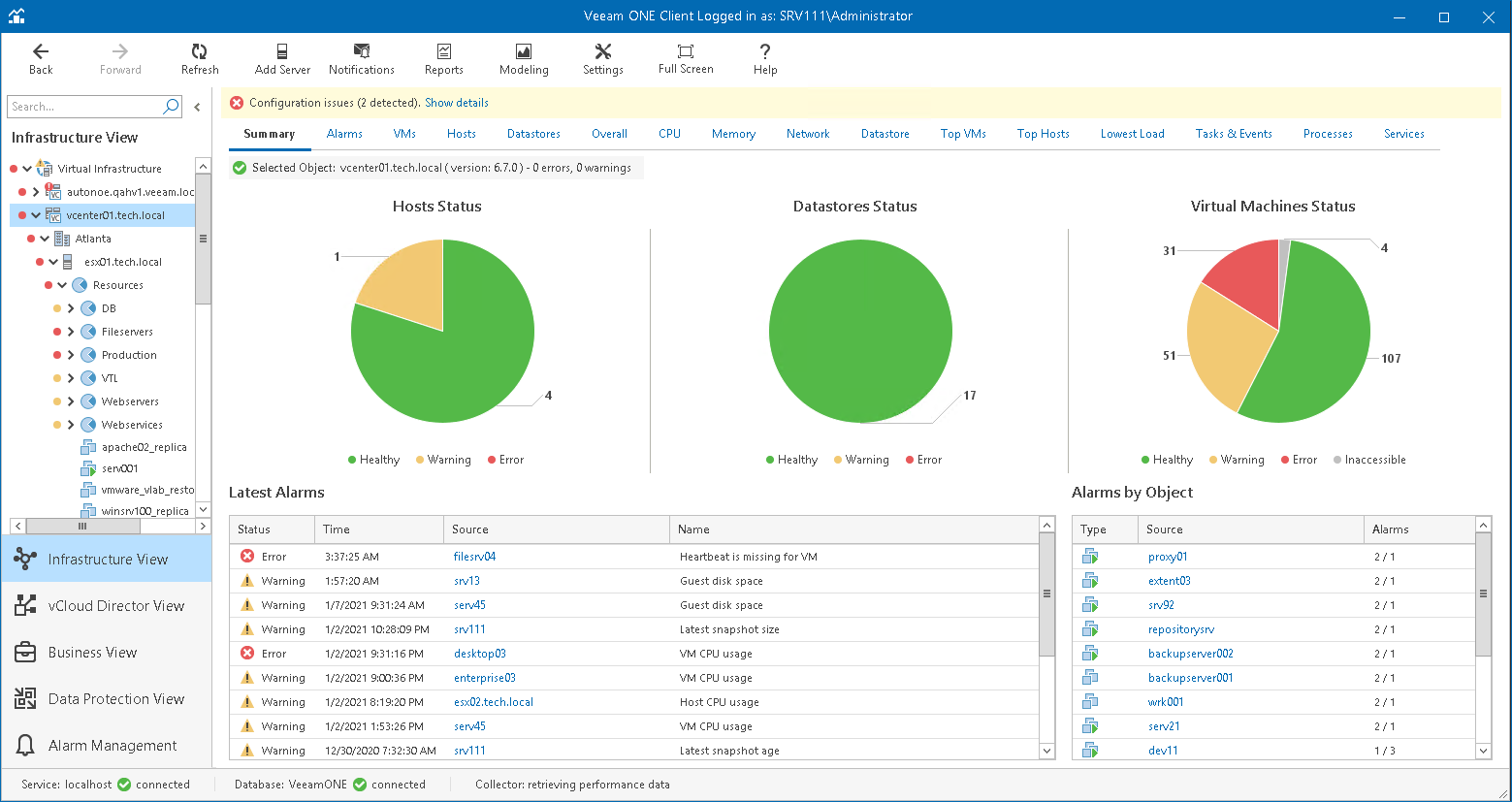 Every chart segment represents the number of objects in a certain state — objects with errors (red), objects with warnings (yellow) and healthy objects (green). Click a chart segment or a legend label to drill down to the list of alarms with the corresponding status for the selected type of virtual infrastructure objects.