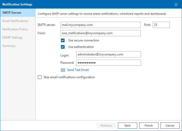 - At the SMTP Server step of the wizard, specify the following details:
