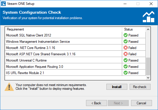 - At the System Configuration Check step of the wizard, click Install to install missing software components and enable missing features, if any.