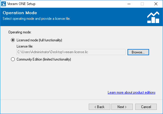 - At the Operation Mode step of the wizard, select Licensed mode and specify the path to purchased license or trial key.