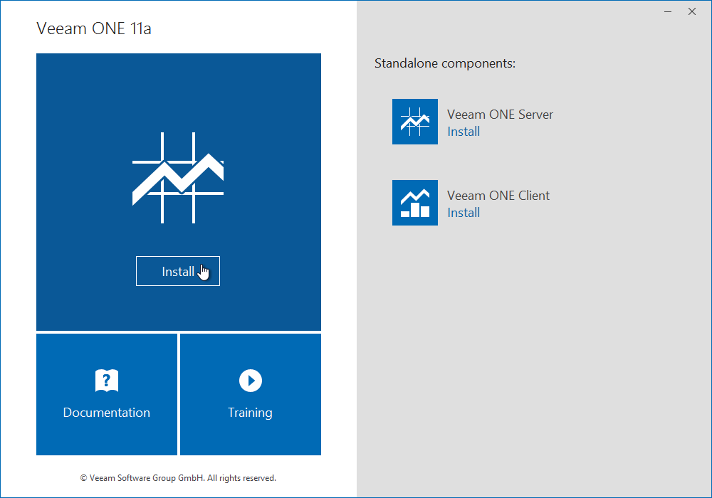 - On the splash window, click Install. The Veeam ONE Setup wizard will open.