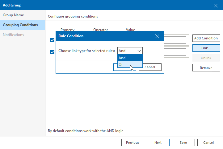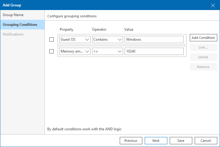Veeam ONE allows combining multiple conditions to create groups. This method makes categories highly customizable, as each group within a category can have its own condition. Conditions can be based on different object properties and logical operators. For one group, you can specify one or more conditions and link them with the AND or OR operator.