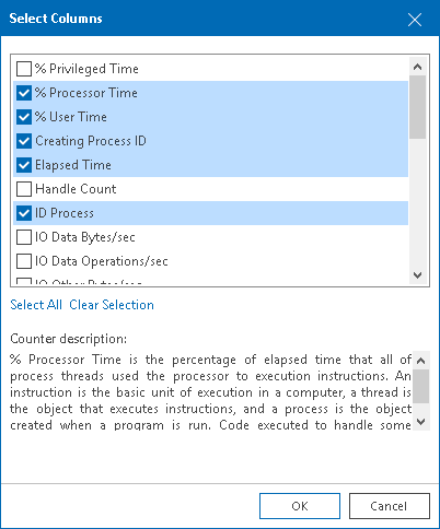 On the Processes tab, column headers show process counters. You can add or remove counters to monitor running processes. To do that: