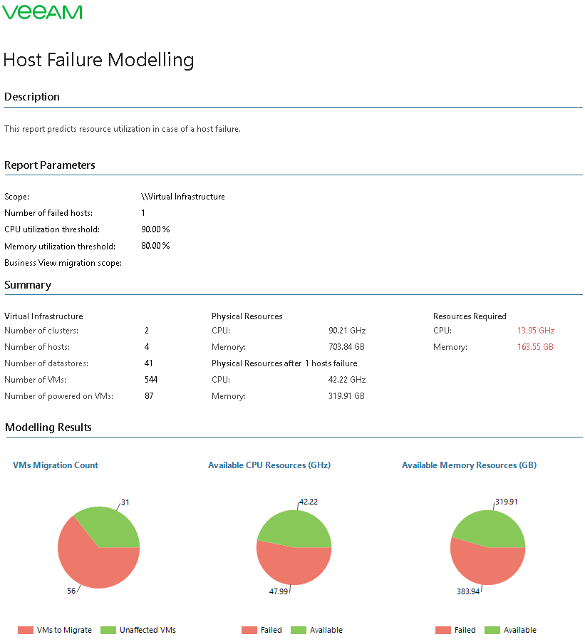 - The Modelling Results charts display the total amount of CPU and memory resources left and lost in clusters in case of a host failure. The VMs Migration Count chart shows the number of VMs that will need to be relocated to another host (VMs to Migrate) and the number of VMs that will operate as usual (Unaffected VMs) in case of a host failure.