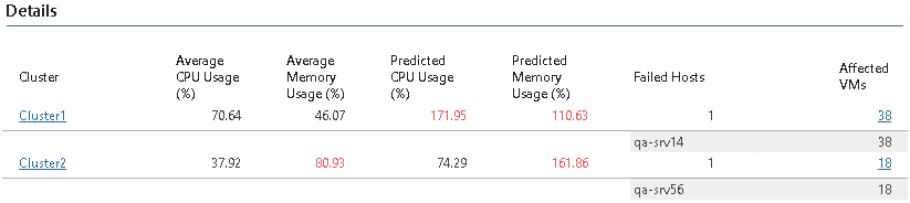 Click a cluster name to drill down to details on current and predicted resource usage for the cluster. Click a number in the Affected VMs column to drill down to details for the VMs that need to be migrated.