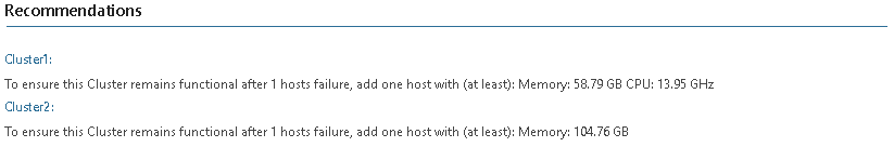 This report allows you both to simulate a failure of one or more hosts, and forecast CPU and memory usage for clusters.