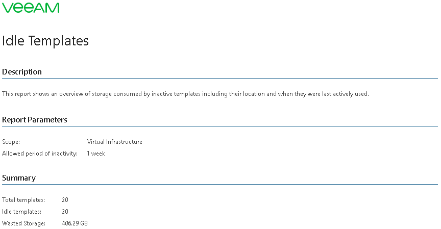 VM templates consume valuable storage resources. Use this report to review the list of your templates and identify templates that can be deleted or moved to less costly datastores to reclaim additional storage space.