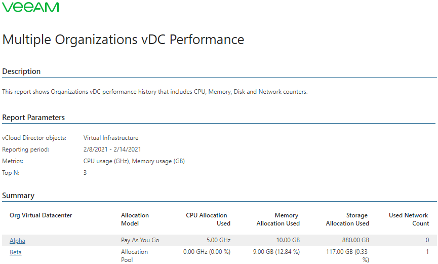 This report aggregates historical data and shows performance statistics for selected organization virtual datacenters across a time range. The report features a predefined list of performance counters and allows you to report on memory, CPU, disk and network usage.