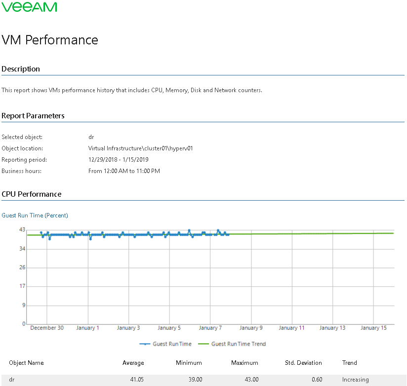 This report aggregates historical data and shows performance statistics for a selected VM across a time range.