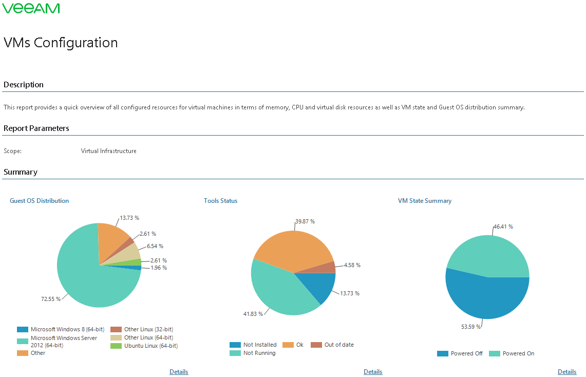 - The Details table provides information for every VM, including data on VM location, computer name, guest OS type, number of vCPUs, amount of allocated memory resources, amount of allocated and used storage resources.