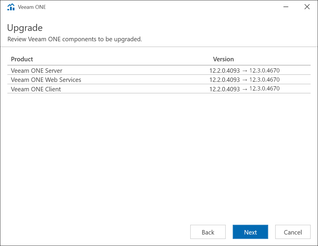 Veeam ONE Setup wizard will automatically detect components of the previous version installed on the machine. At the Upgrade step of the wizard, review the components to upgrade.