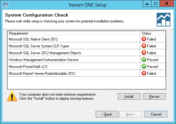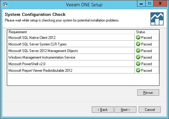 Before proceeding with the installation, the installer will perform system configuration check to determine if all prerequisite software is available on the machine. To learn what software is required for Veeam ONE installation, see System Requirements.
