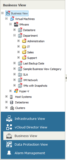 The Business View tree displays a hierarchical list of categorization groups configured in Veeam ONE Business View. It presents the virtual infrastructure topology in business terms and allows you to monitor, alert and report on custom categorization units in your virtual environment.
