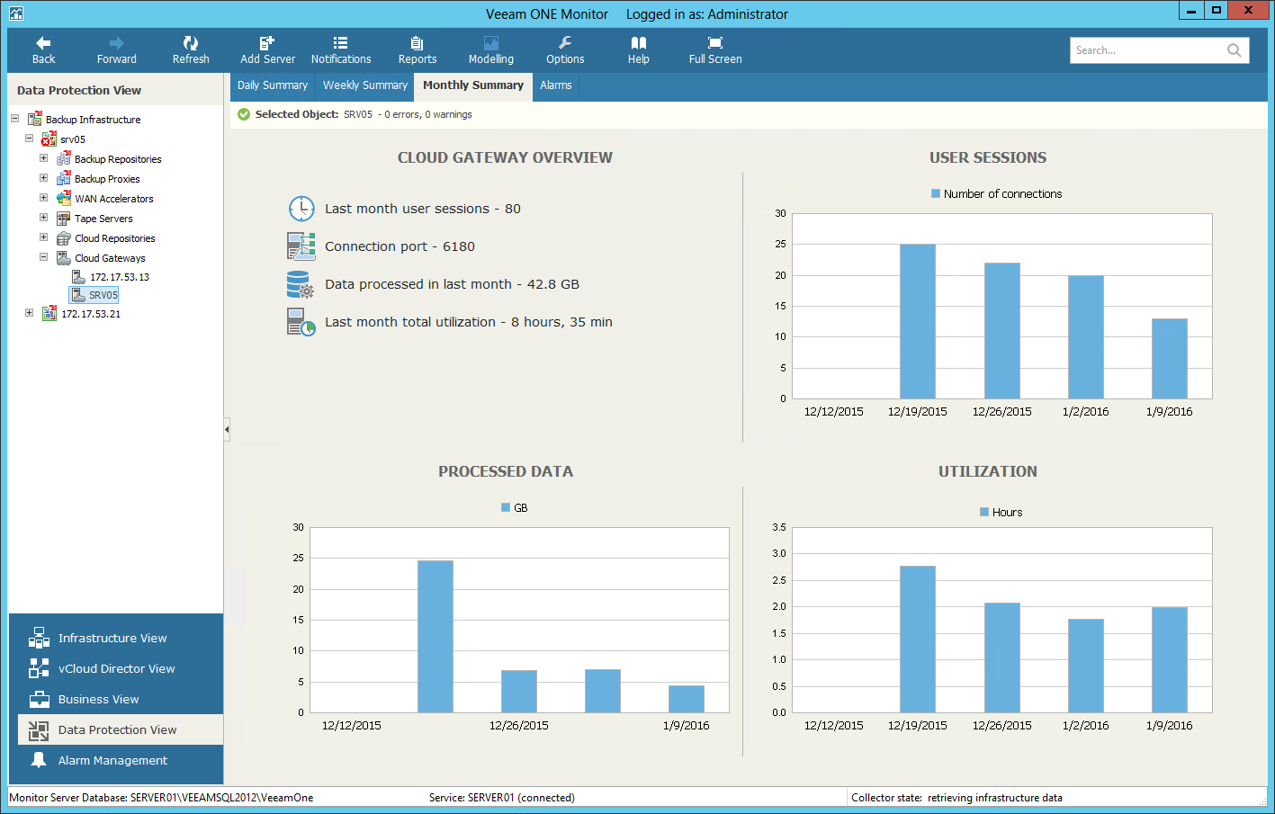 The Data Transferred/Processed Data chart shows the amount of backup data that the cloud gateway transferred to the cloud repository over the past period. The chart can help you measure the total amount of backup traffic coming through the cloud gateway.
