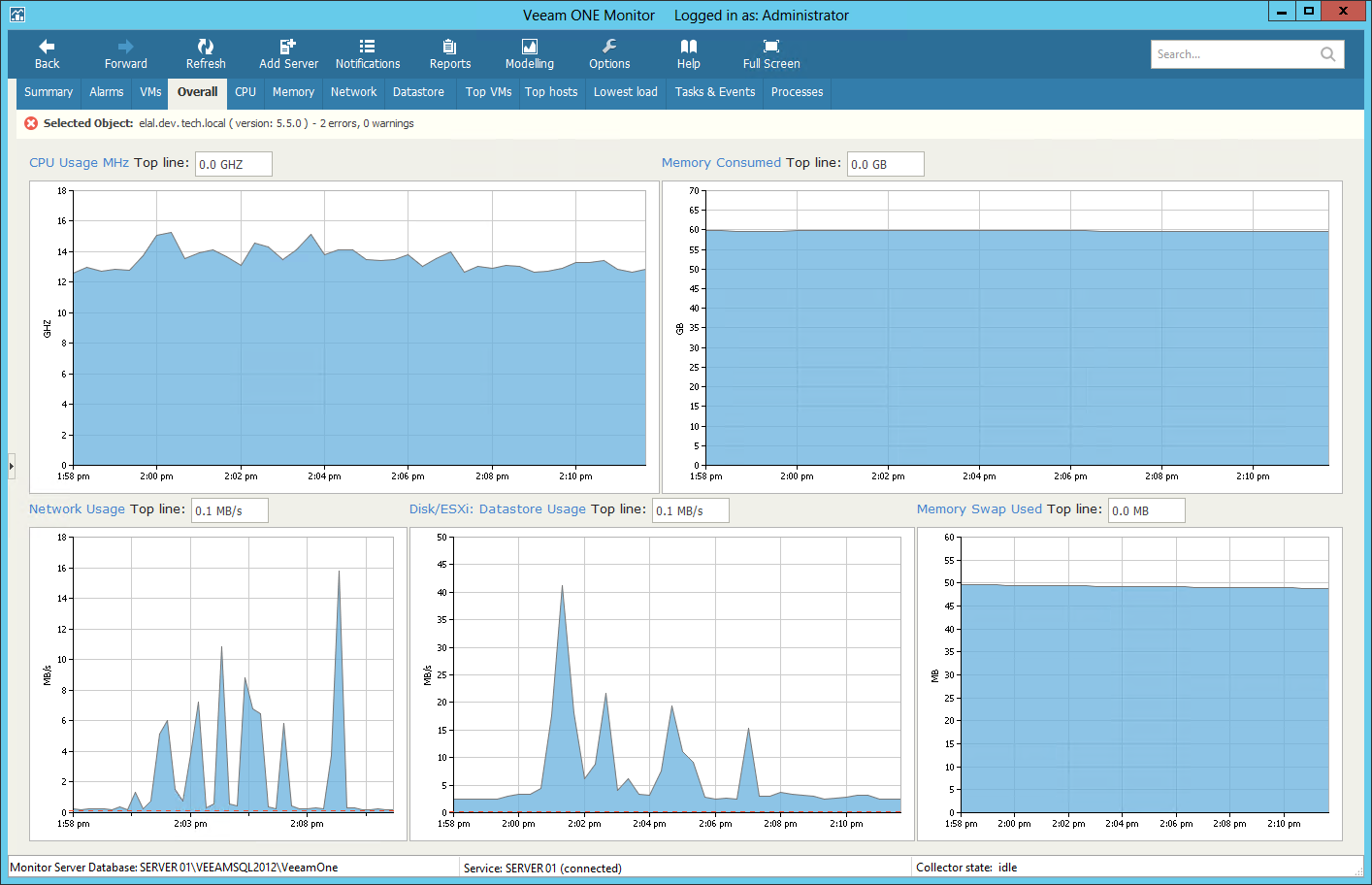 The Overall chart shows aggregated performance data for the selected virtual infrastructure object or segment: CPU, memory consumed, memory swap used, network and datastore usage. Performance data in the chart is shown for the previous 15 minutes.