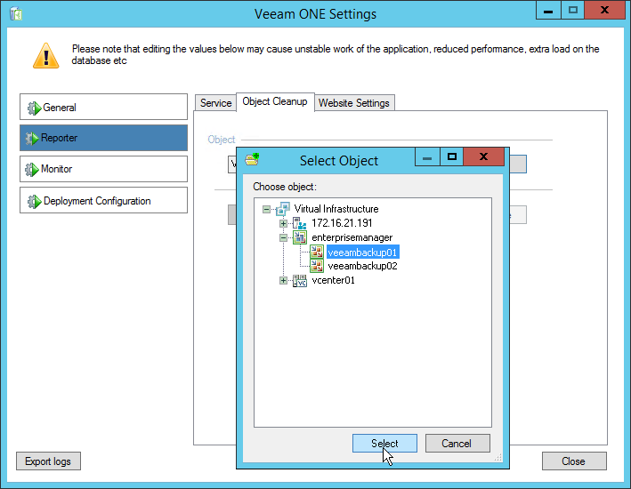 On the Object Cleanup tab, you can remove from the Veeam ONE database residual data on deleted infrastructure objects.