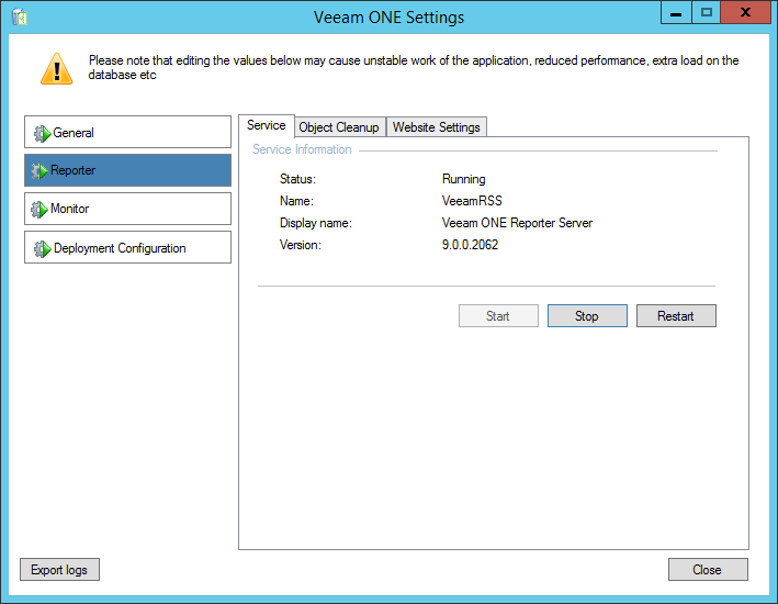 On the Service tab, you can start, stop or restart the Veeam ONE Reporter Server service. These operations may be required to complete Veeam ONE configuration updates.
