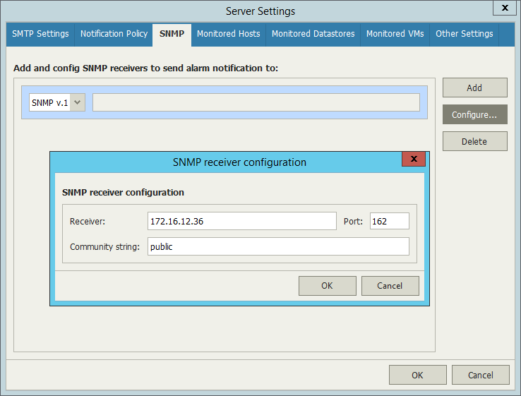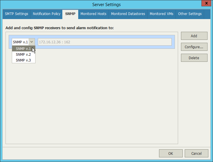For detailed information on how to configure SNMP settings, see section SNMP Traps in Veeam ONE Working with Alarms Guide.