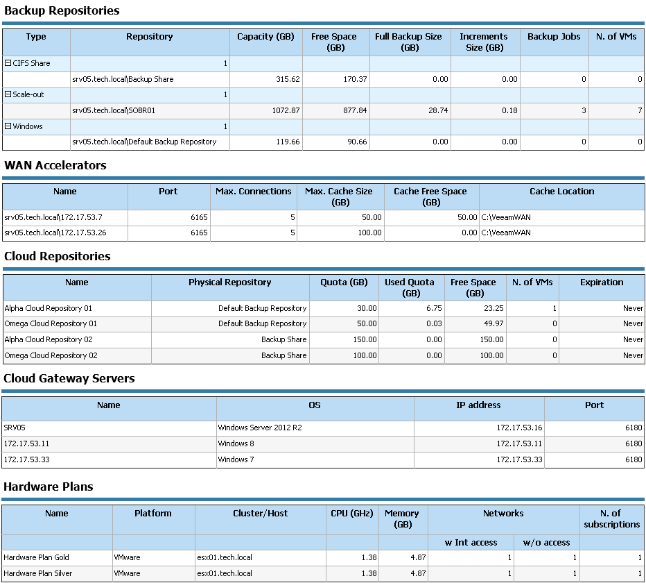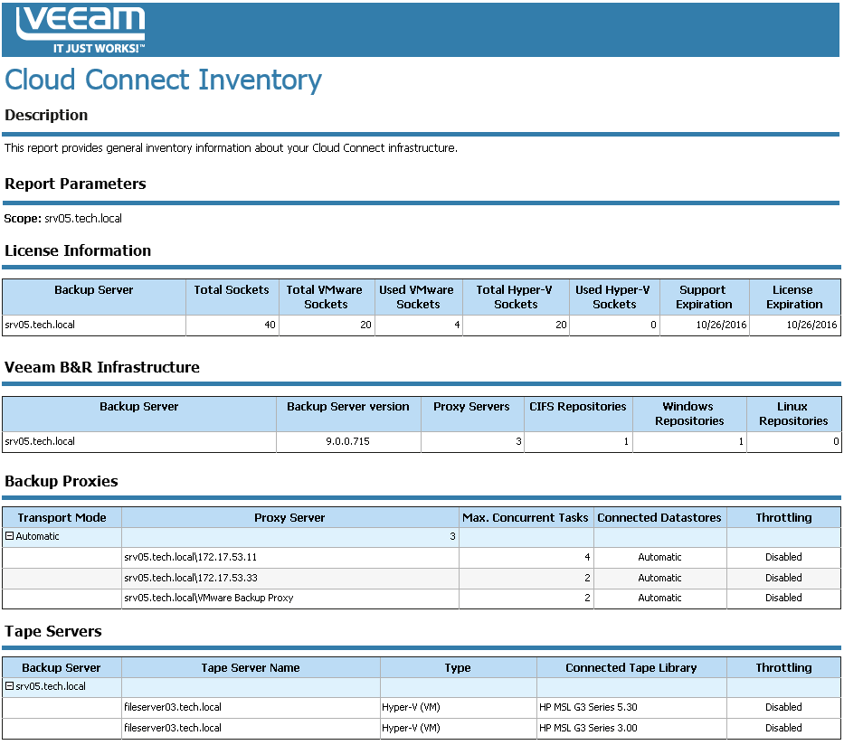 This report provides inventory information on the Veeam Backup & Replication and Cloud Connect infrastructures.