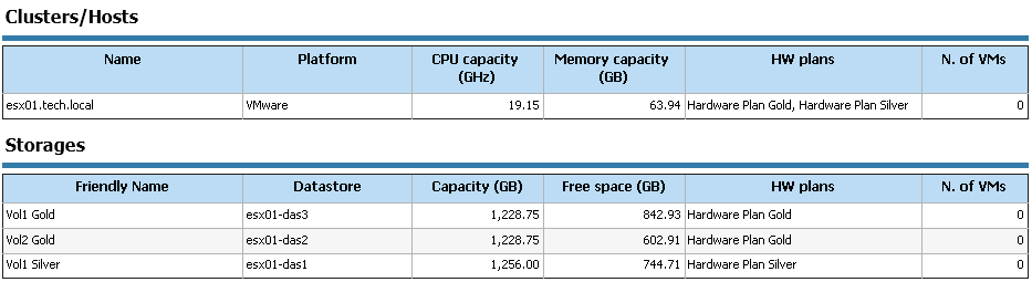 - Hardware Plans section shows the amount of virtual computing, memory and storage resources allocated to a hardware plan and the number of users subscribed to each plan.