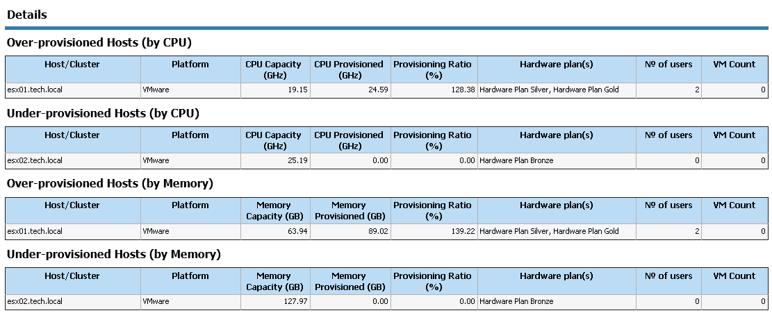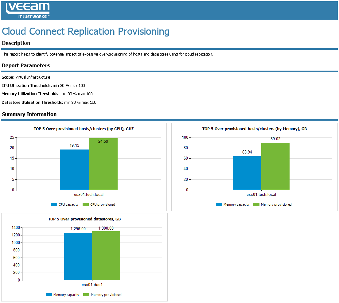 The report helps define whether existing hardware plans match hosts and datastores capabilities. Use this data to avoid potential issues that may be caused by excessive over-provisioning of cloud replication hosts.