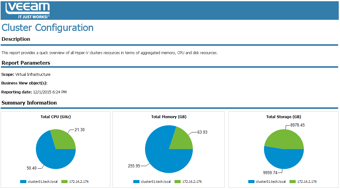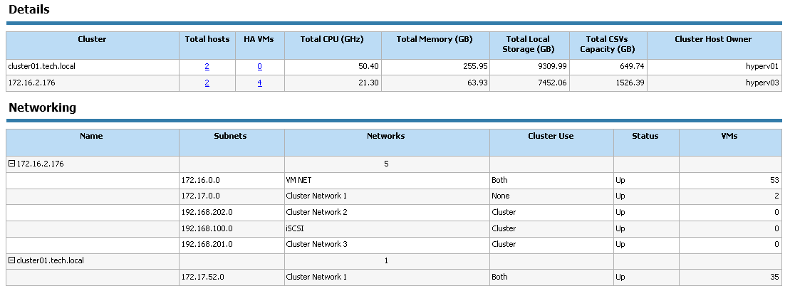 The report provides an overview of cluster resources in terms of memory, CPU and storage utilization. For each cluster included in the report, the Details table displays information on total number of hosts and VMs in the cluster, total amount of available cluster resources and the name of the cluster host owner. The report also shows network configuration for each cluster.