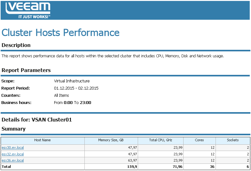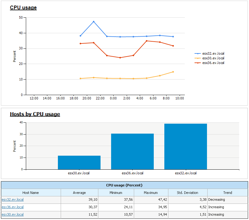 This report aggregates historical data and shows performance statistics for all hosts in selected clusters across a time range. The report features a predefined list of performance counters and allows you to report on memory, CPU, disk and network usage.