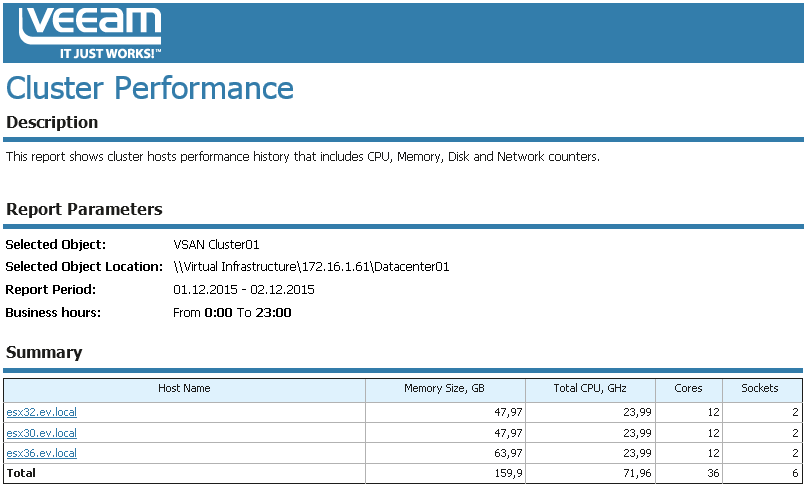 The report provides an overview of hardware resource consumption for the selected cluster. This information may help you identify clusters with performance issues, balance workloads, right-size resource provisioning, redefine DRS settings and optimize cluster overall performance.