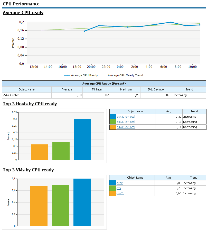 The report shows tables and performance charts with statistics on CPU, memory, disk and network usage for the cluster, lists top resource consuming hosts and calculates resource usage trends for them.