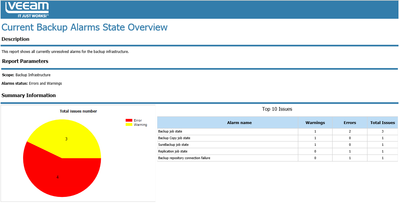 You can use this report to detect and resolve current and the most pressing issues with Veeam Backup & Replication.