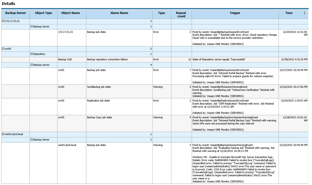 This report shows all unresolved alarms that Veeam ONE Monitor triggered for the Veeam Backup & Replication infrastructure. The report includes the following components: