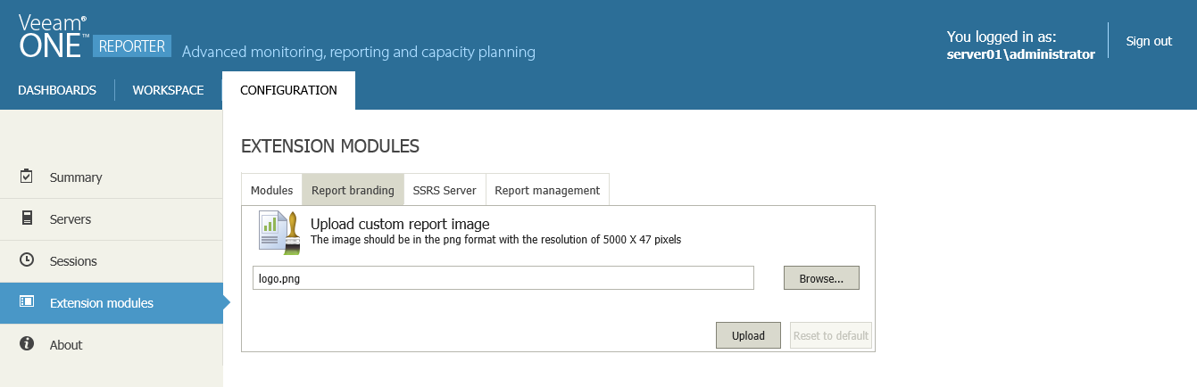 To restore the default report header, use the Reset to default button in the Upload custom report image dialog box.