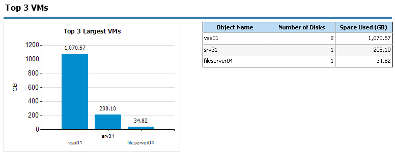 The report provides information on total capacity, used, free and provisioned space, and calculates space utilization trend for each volume. The report also includes the Top 3 VMs section that shows VMs that consume more storage space than other VMs.