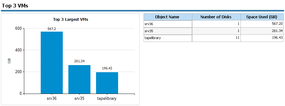 The report provides information on total capacity, used, free and provisioned space, and calculates space utilization trend for each datastore. The report also includes the Top 3 VMs section that shows VMs that consume more storage space than other VMs.