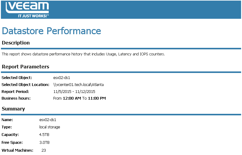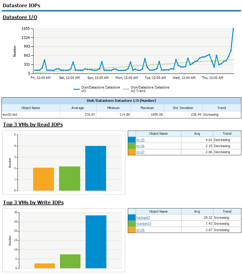This report aggregates historical data and shows performance statistics for a selected datastore across a time range.