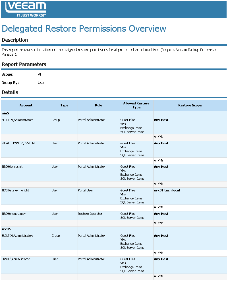 This report analyzes restore permissions configured in Veeam Backup Enterprise Manager. The report returns the list of users who can restore entire VMs, guest OS files and application items via the Veeam Backup Enterprise Manager or Veeam Self Service File Restore portal, and shows what type of data these users can restore according to the effective policies.