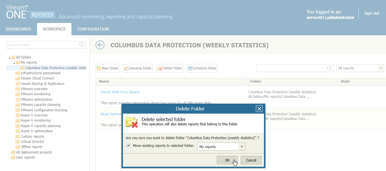 - If the folder you are trying to delete contains reports or subfolders, you may choose to move the folder contents to another folder. To do so, select the Move existing reports to selected folder check box, choose the new destination folder from the list and click OK. If you leave the check box cleared, the folder will be deleted along with its contents.