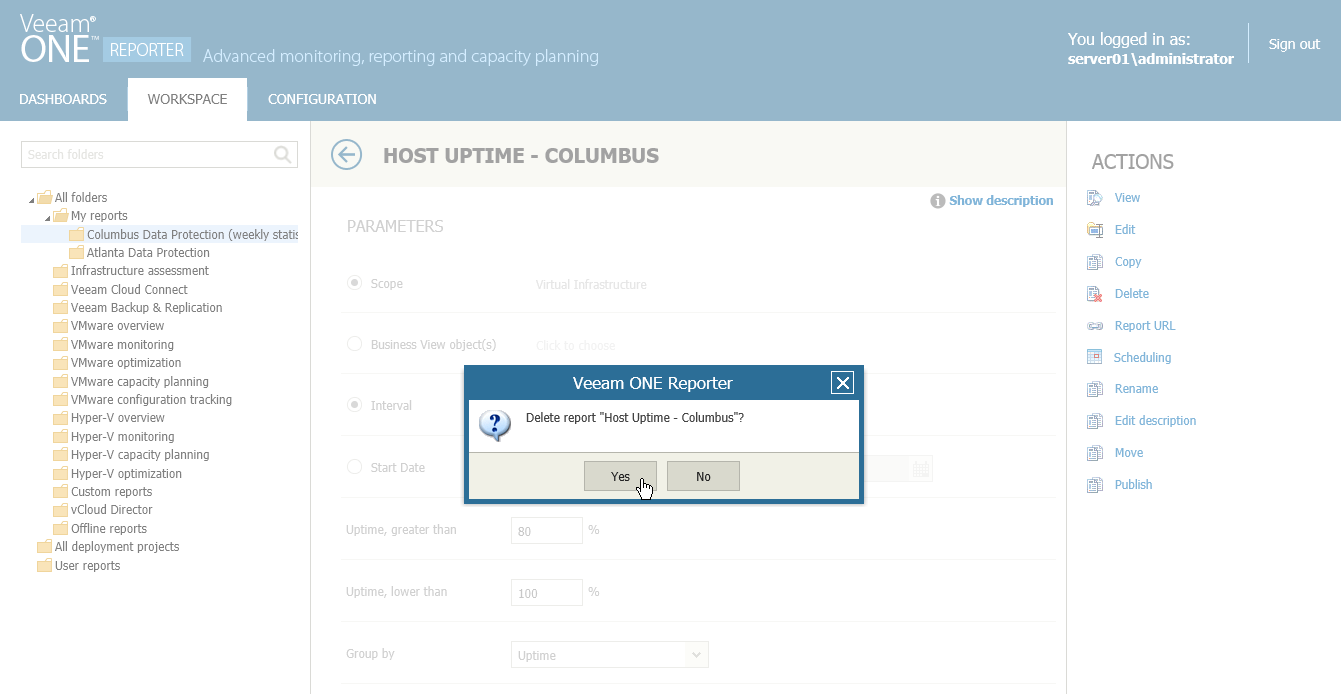 - In the displayed dialog box, click Yes to confirm report deletion.
